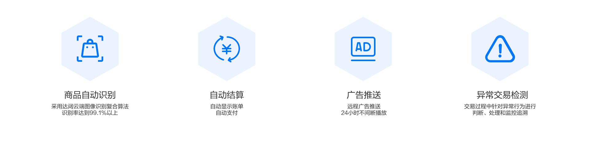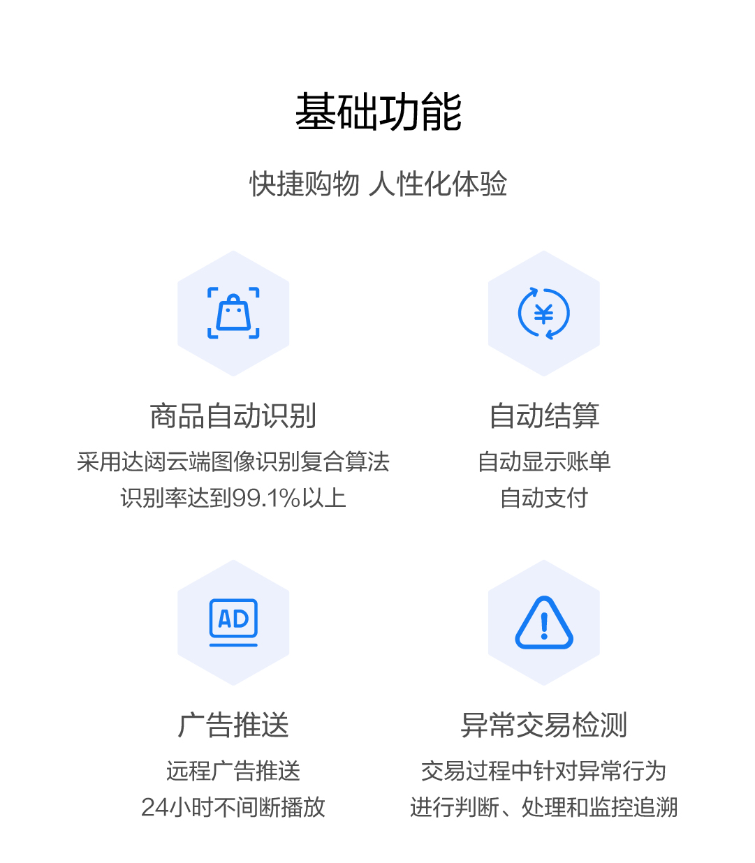 * 智能选品、运营、补货,降低各环节运营成本 * 帮助线下门店打通“人--货--场”数据 * 可视化看板,运营情况实时洞察,轻松远程管理设备 * 支持移动端、Web端后台运营管理
